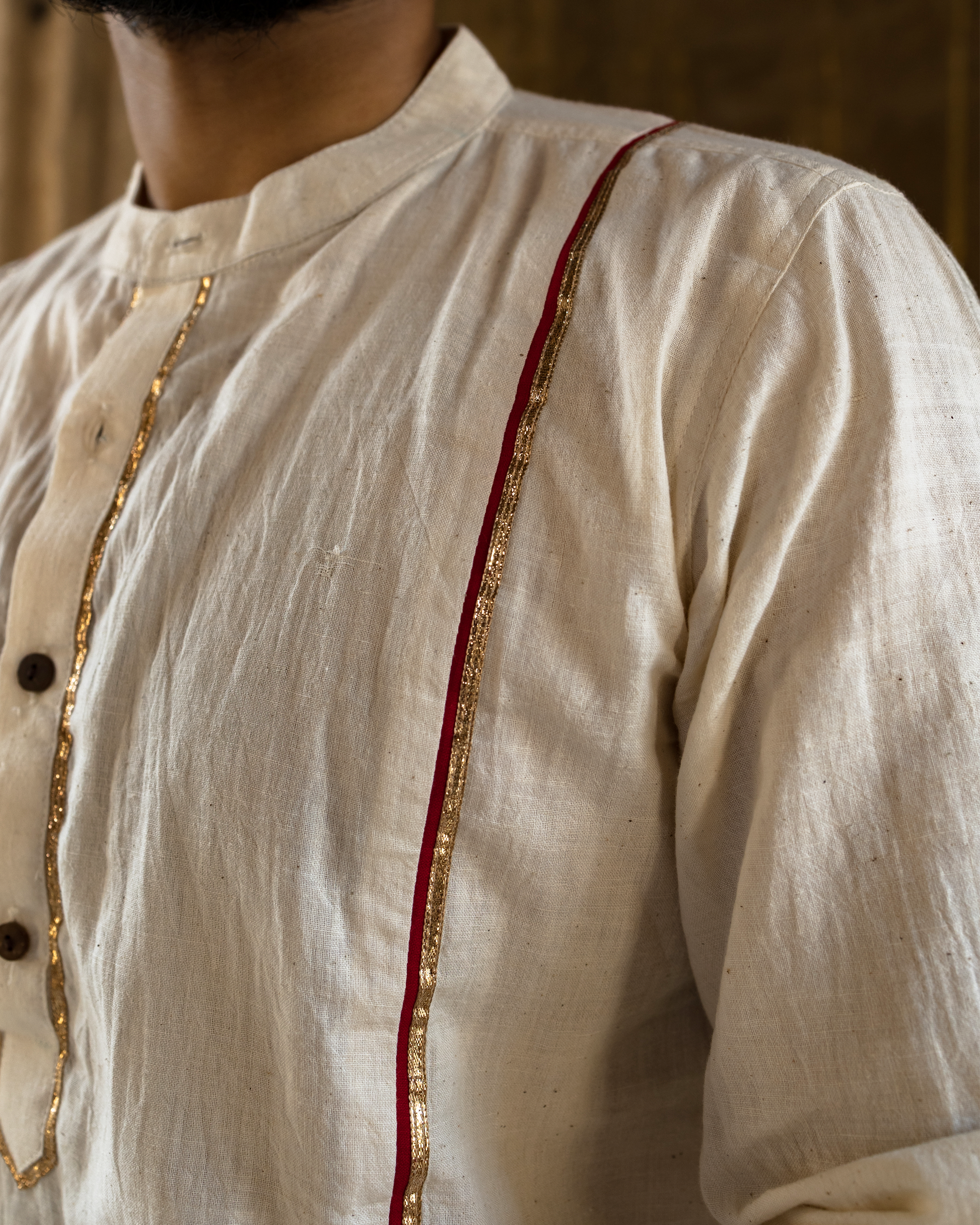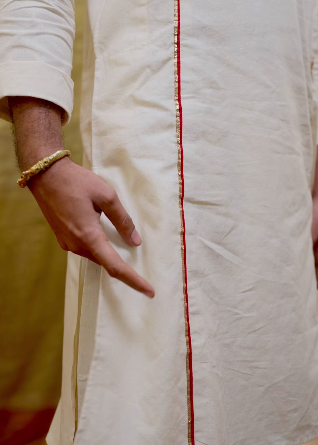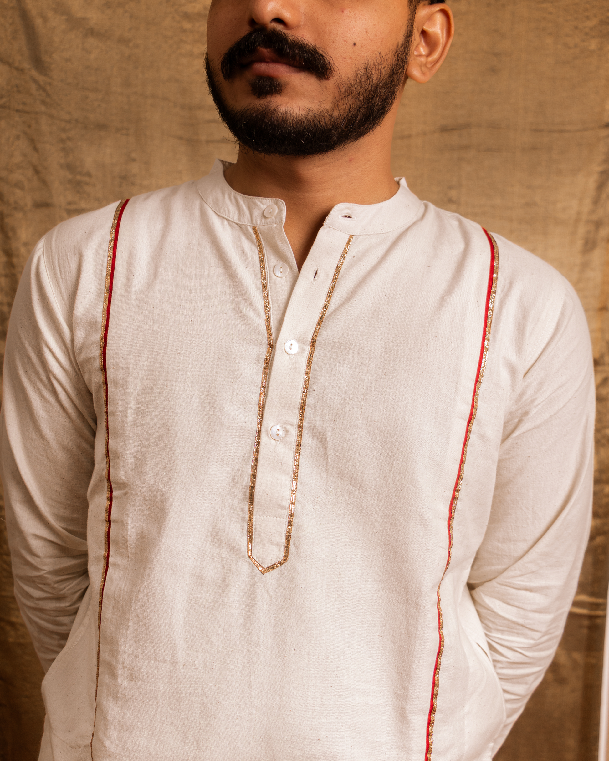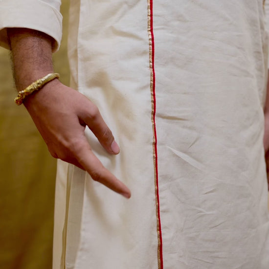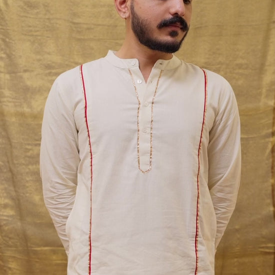 Detailing: Red stripes run along both sides of the kurta, extending its full length and finished with gotta patti. The placket carries the same subtle detailing of toi patti.