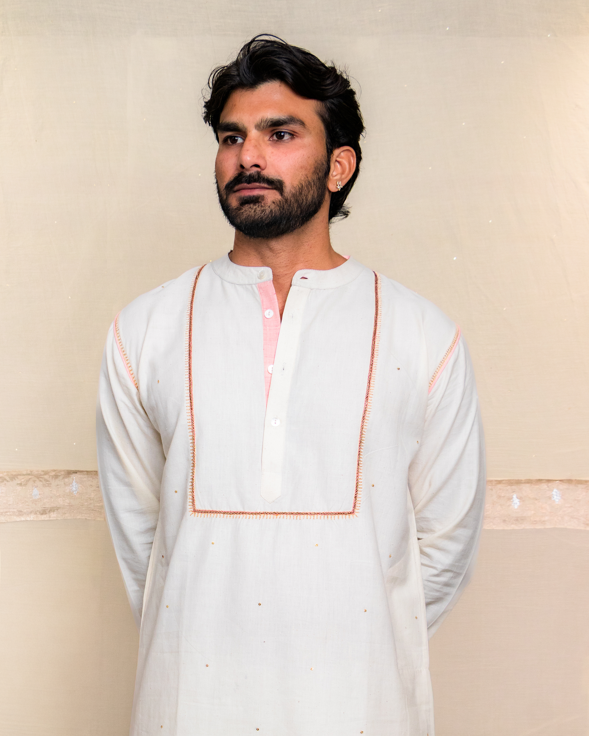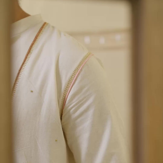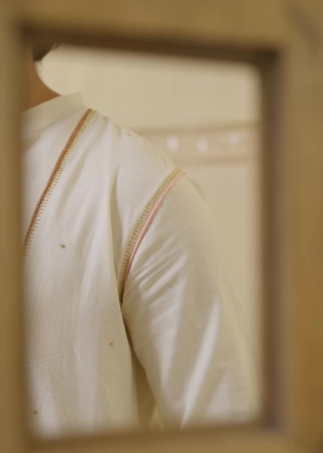 Detailing: A panel extending from the neckline to the chest frames the placket, hand-embroidered with zardozi and aari work. Subtle brass tikkis are scattered across the front, with soft lotus-pink accents in hand embroidery at the placket and shoulders. An aari-embroidered line finishes the sleeve ends, a lotus motif at the back, in zardozi and aari handwork, completes the piece.