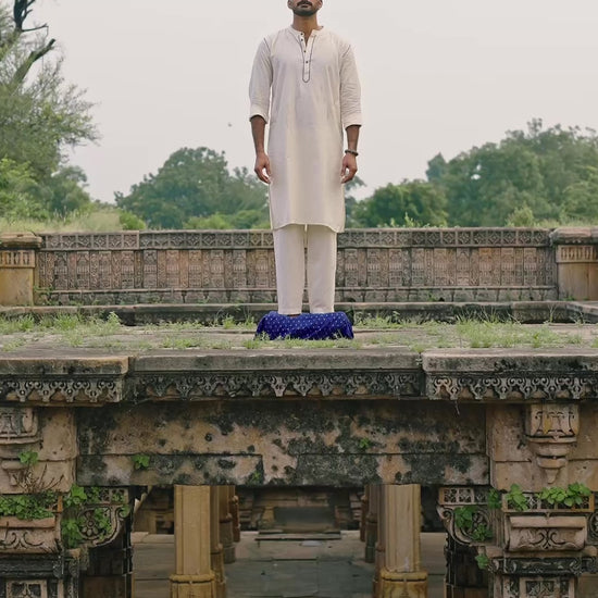 Detailing: Pichho tako handwork on the placket and shoulders. A single straight line runs down the center back, adding depth and character.