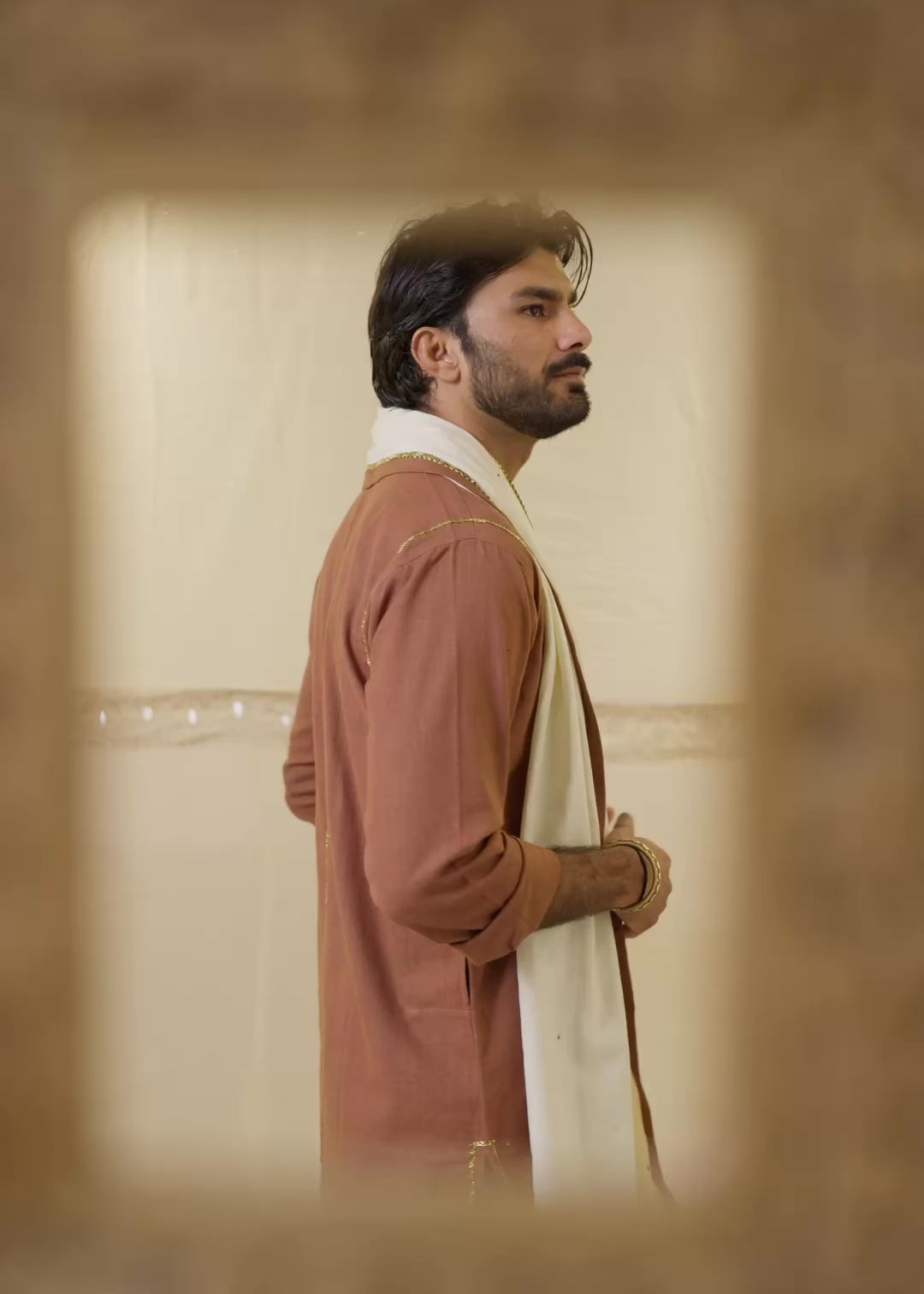 Paired with: A beige dupatta with earthy brown border accents, finished with gota patti and tikki work.