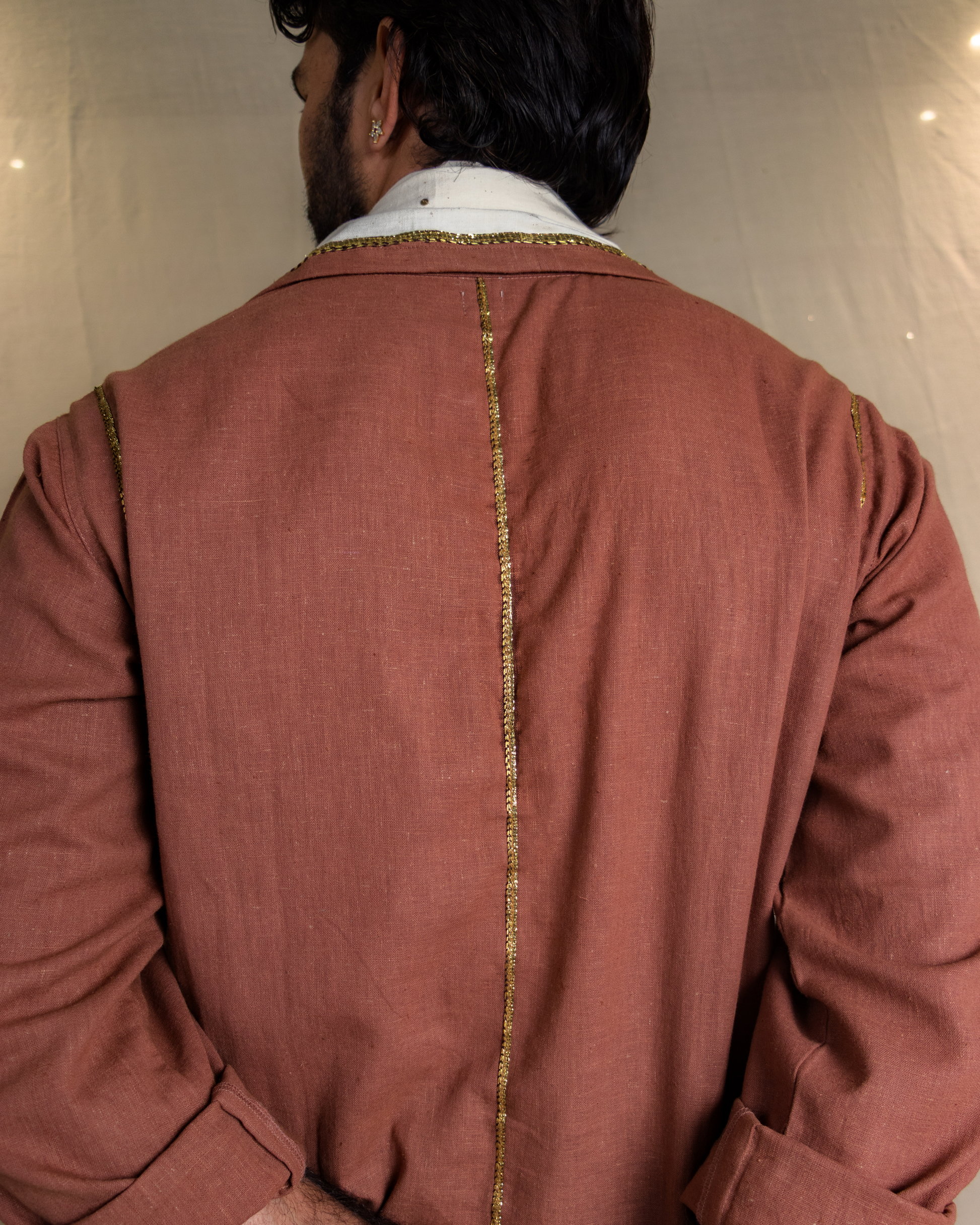 Detailing: Subtle brass tikkis scattered across the front, with gota patti detailing along the placket. Gota patti lines run along the shoulders, hem, and a single straight line at the back.